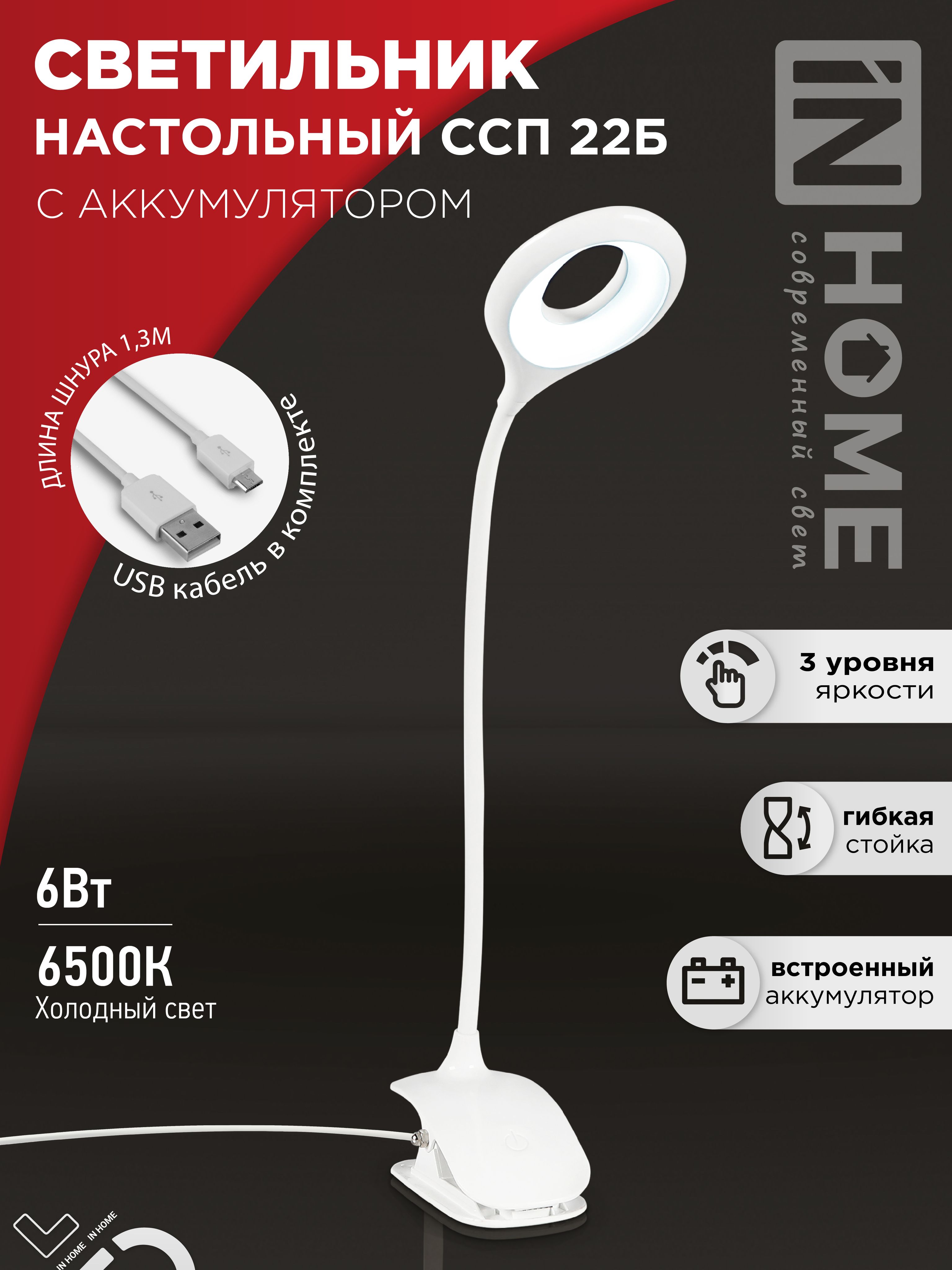 Светильник настольный светодиодный CRAFT ССП-22Б аккумулятор 6Вт 480Лм, сенсор-диммер, USB-кабель, на прищепке БЕЛЫЙ IN HOME