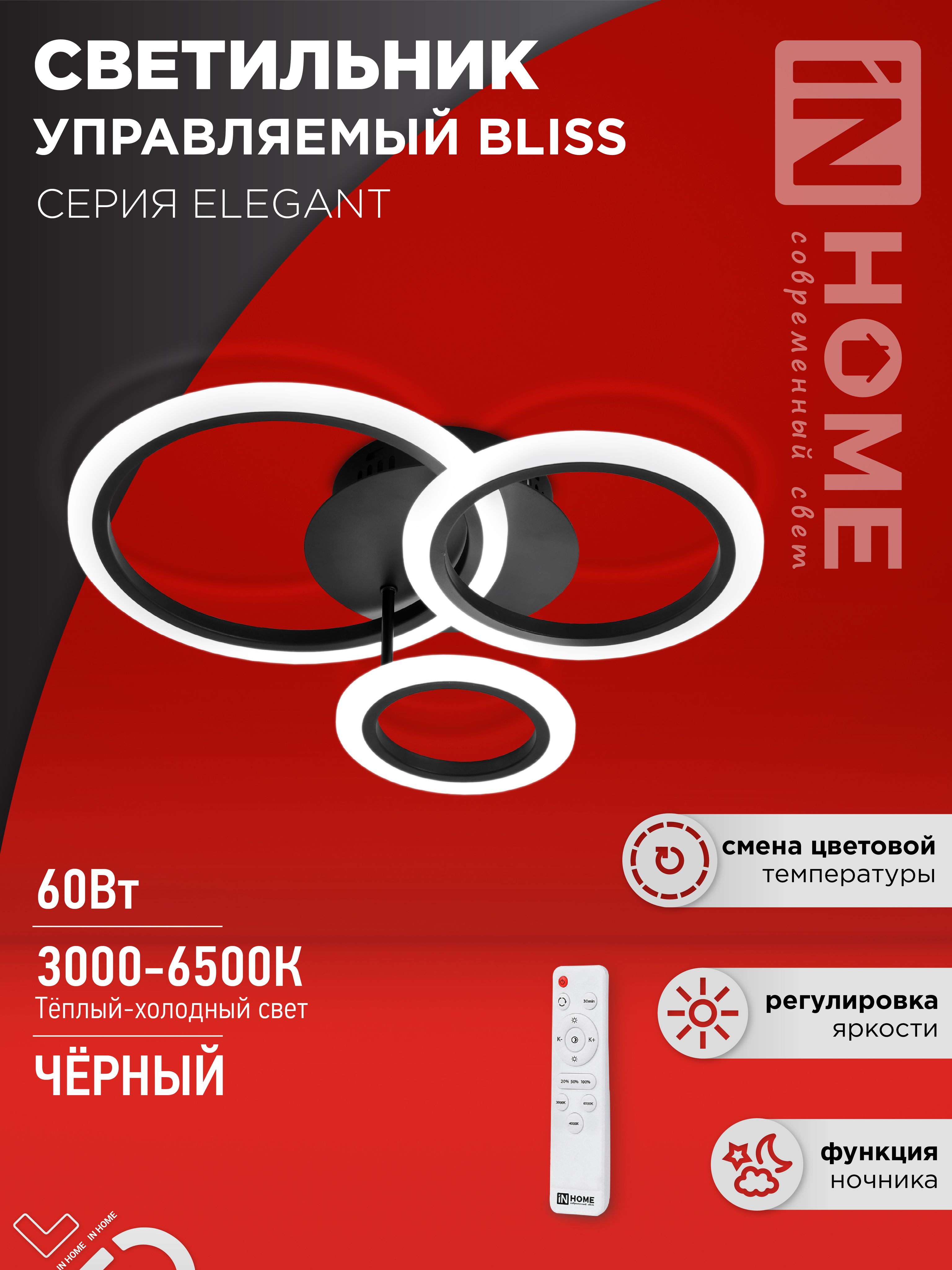 Светильник светодиодный ELEGANT BLISS-B 60Вт 230В 3000-6500K 4700Лм 508х390х120мм c пультом ДУ черный IN HOME