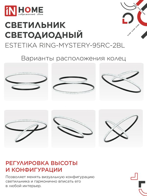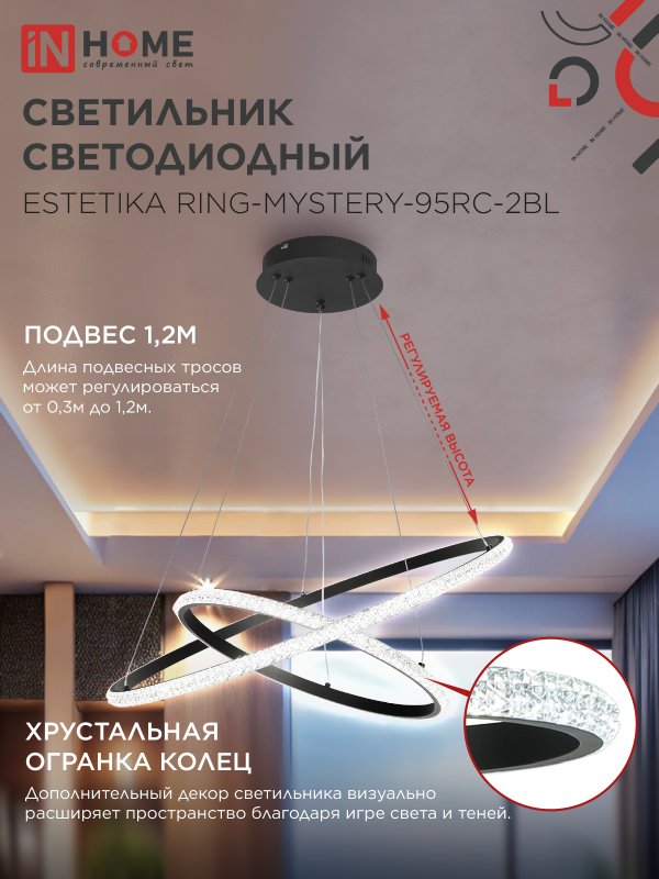 Светильник светодиодный ESTETIKA RING-MYSTERY-95RC-2BL 95Вт 3000-6500K 600/400 1.2м трос пульт ДУ черный IN HOME