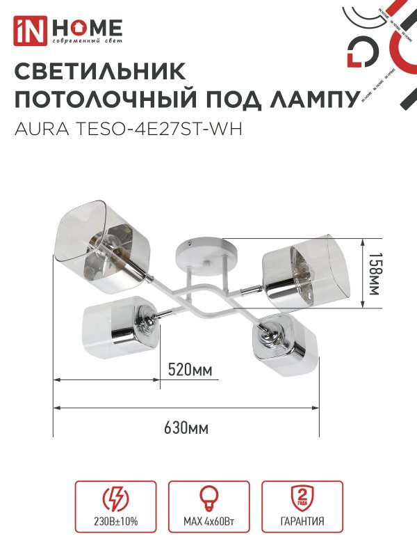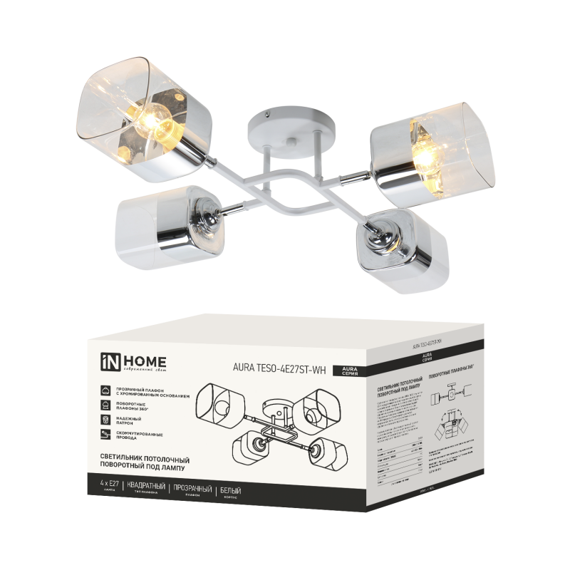 Светильник потолочный поворотный AURA TESO-4E27ST-WH 4хЕ27 прозрачные плафоны, белый корпус IN HOME