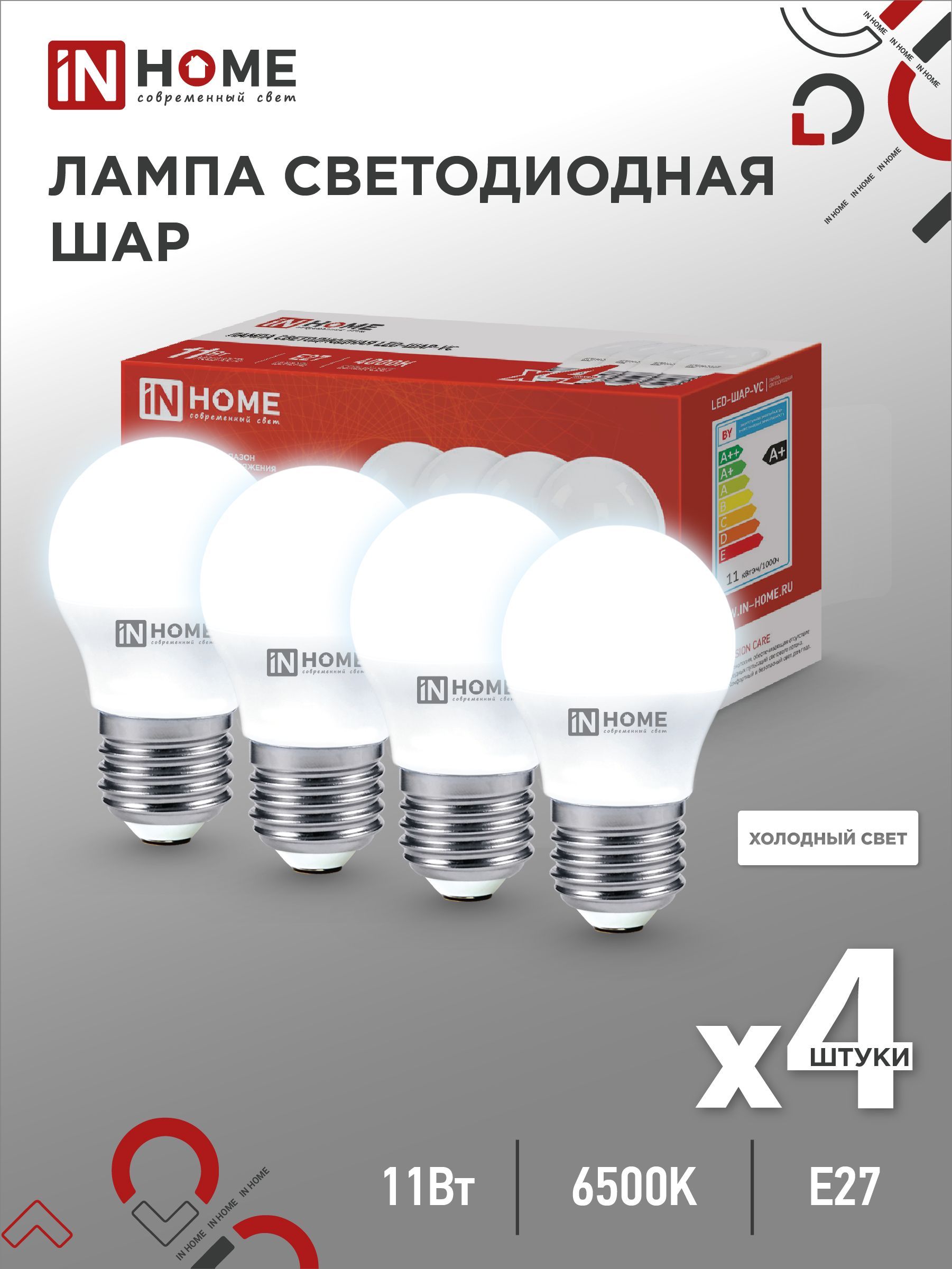 Лампа светодиодная LED-ШАР-VC 4PACK 11Вт 230В Е27 6500К 1050Лм (4шт./упак) IN HOME