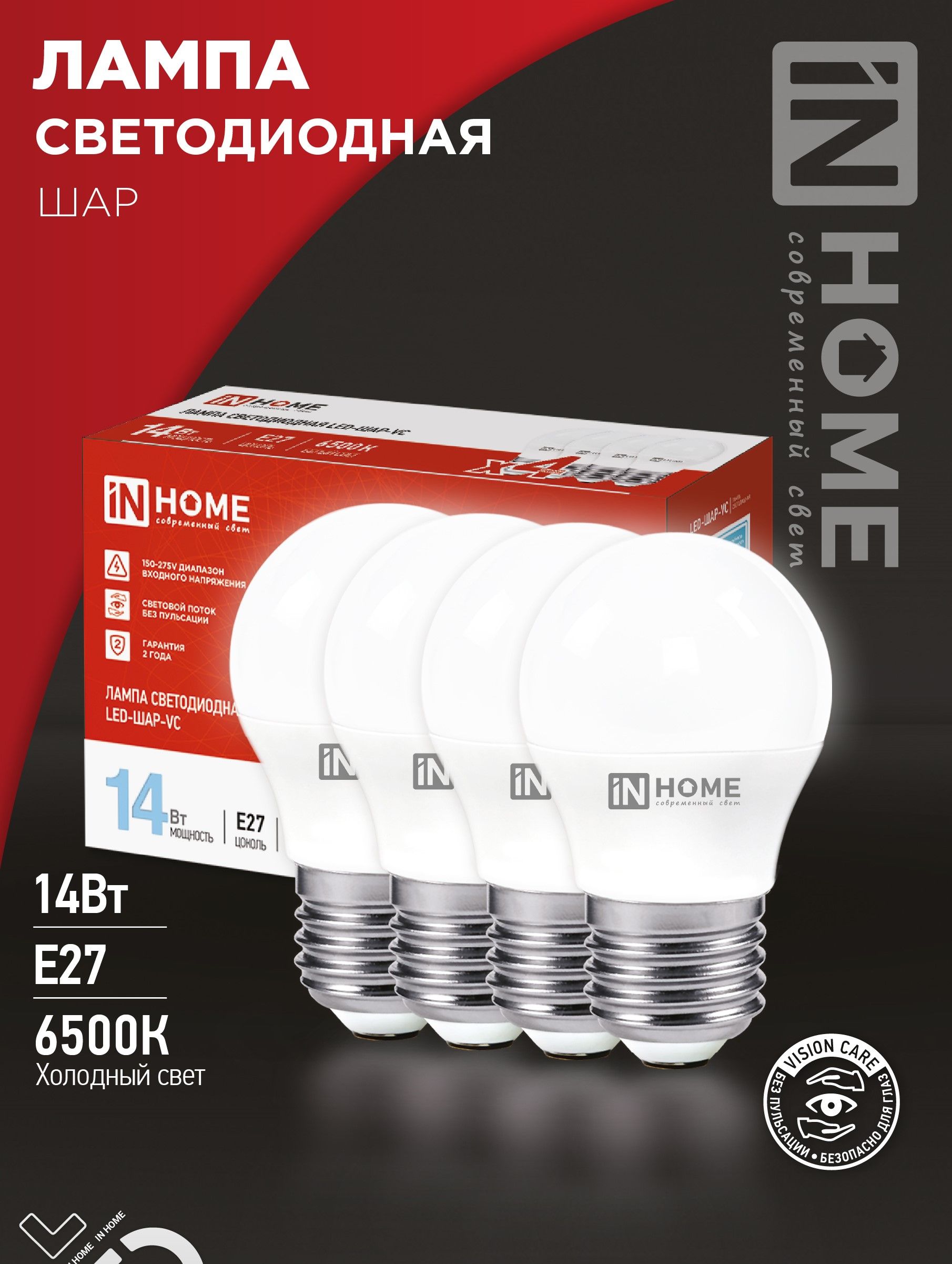 Лампа светодиодная LED-ШАР-VC 4PACK 14Вт 230В Е27 6500К 1330Лм (4шт./упак) IN HOME